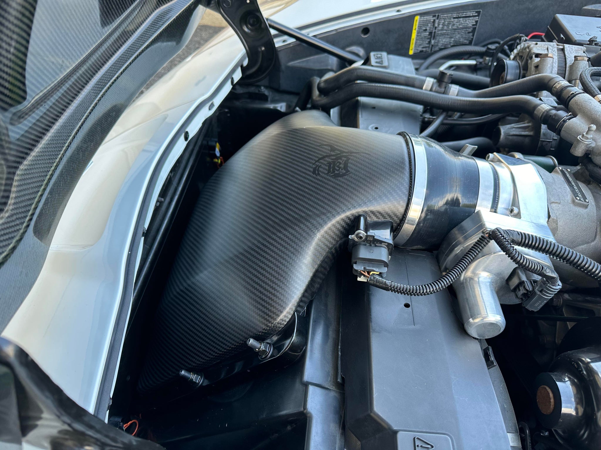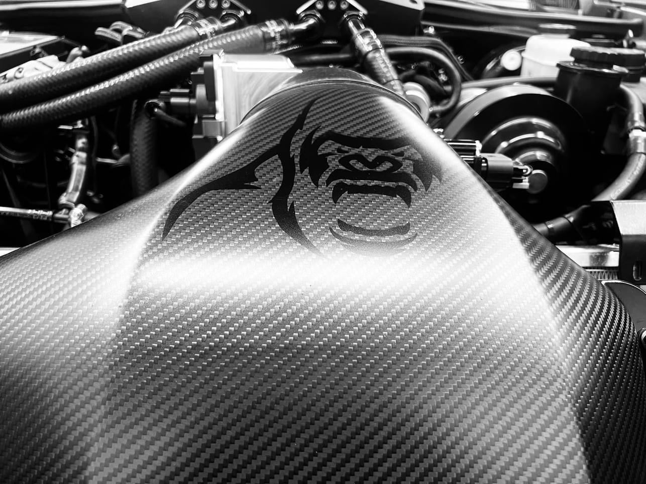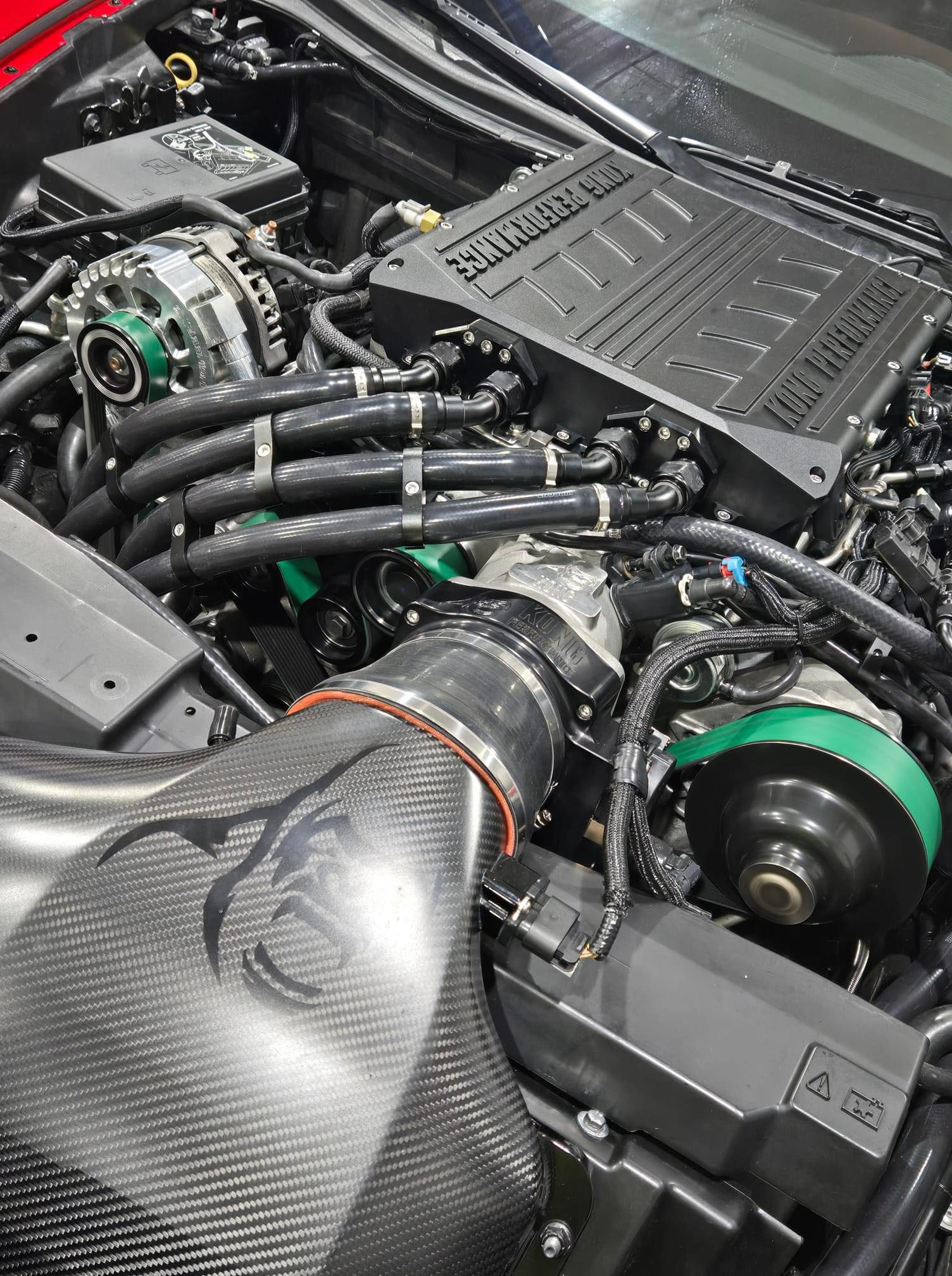 Product Details: The Kong ZR1 Ram Air Intake System was designed to maximize available airflow to the inlet side of the supercharger like never before. Our new Ram Air design allows for even more airflow while maintaining additional hood clearance and a smooth MAF signal for great driveability. All aluminum components are anodized black with the semi gloss carbon for a unique look under the hood. Detailed installation instructions with a template for trimming the shroud are included in the kit.
